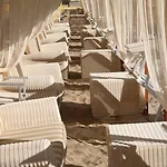 Na pláži jsou wifi zdarma, lehátka a slunečníky.